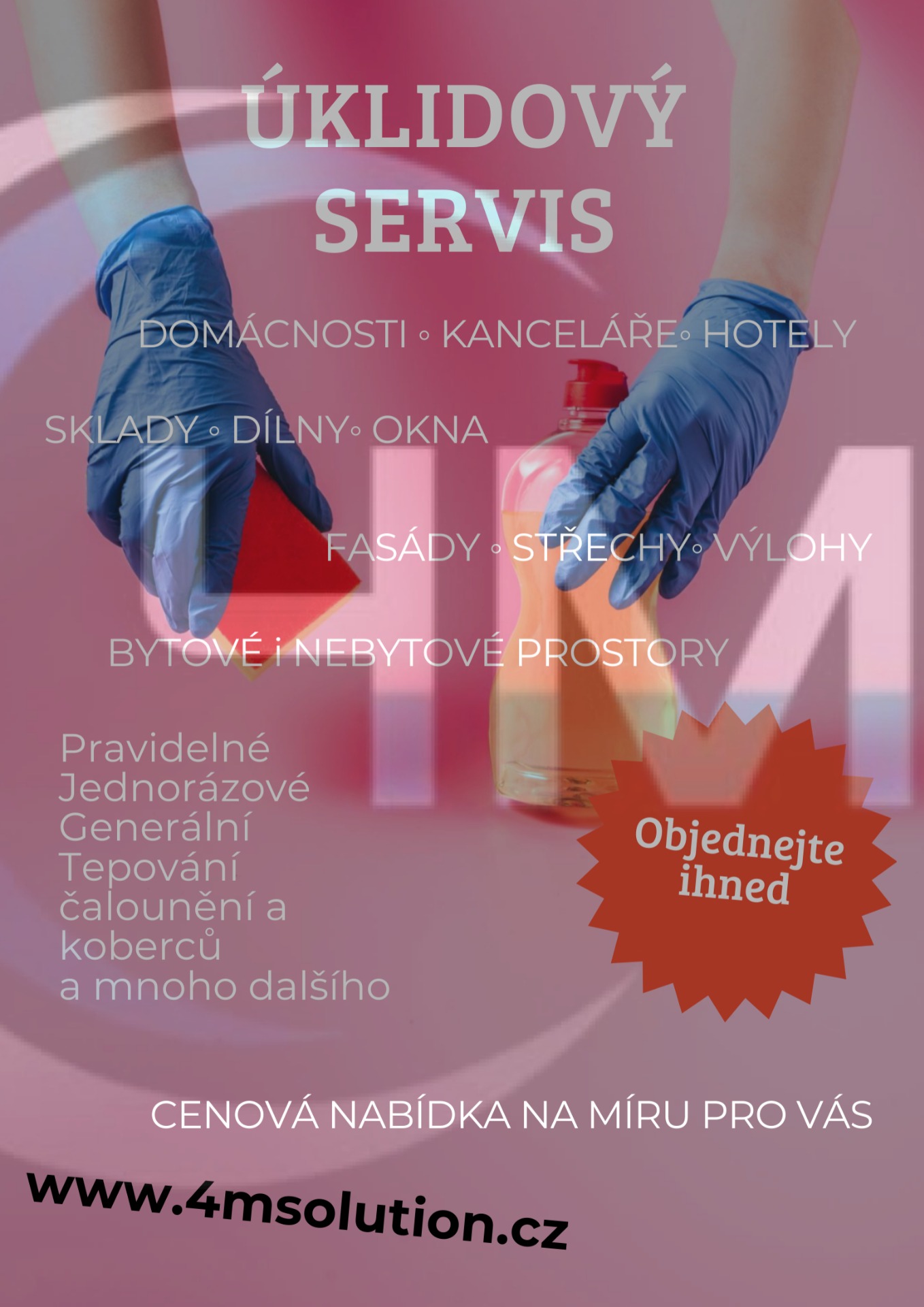 Pravidelné, generální či jednorázové bytových i nebytových prostor. Čištění sedacích souprav, křesel, židlí, koberců. Úklid domácností, kanceláří, firem, skladů, dílen, servisů. Mytí oken a výloh. Oprava a renovace koženého materiálu.